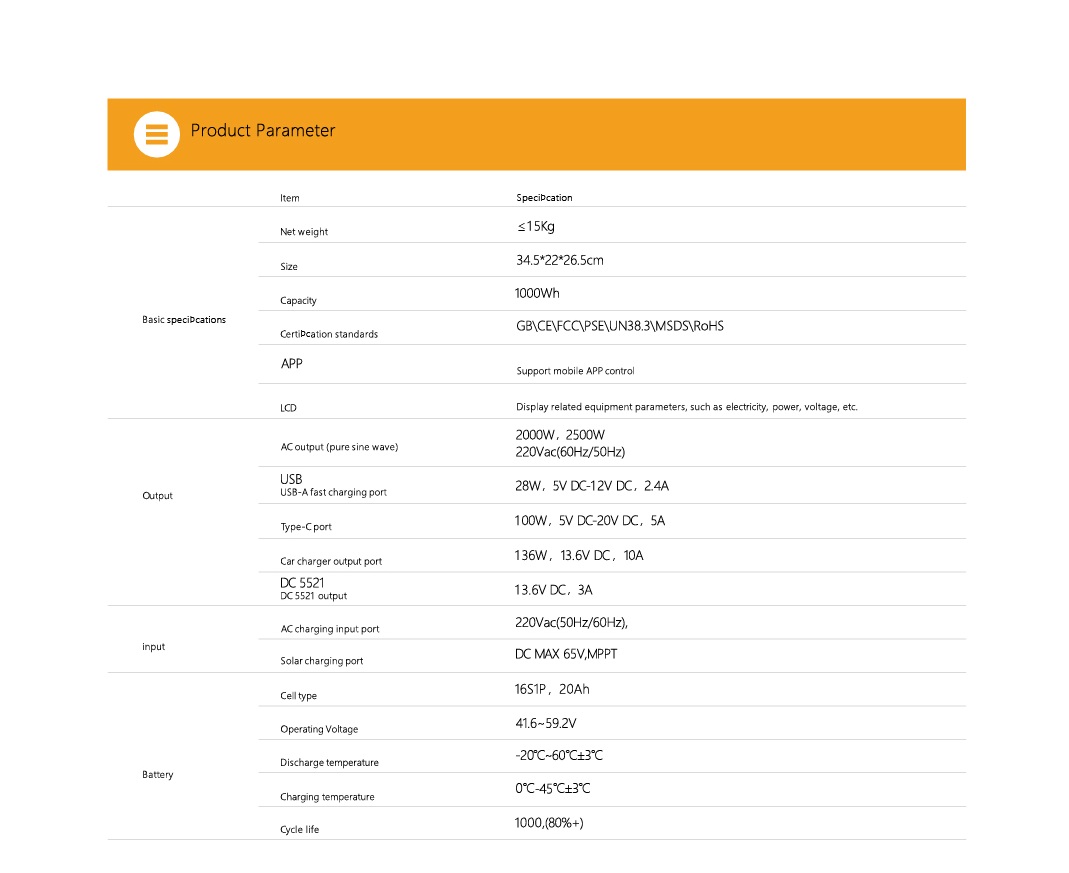 This product is a portable energy storage power supply with a built in high efficiency power lithium ion battery, a safe lithium battery management system (BMS) and an efficient energy conversion circuit. It has the characteristics of light weight, small size and high power, providing customers with convenient mobile power. Application scenarios: family emergency, outdoor travel, outdoor emergency, car power supply, medical rescue, field operations, etc.